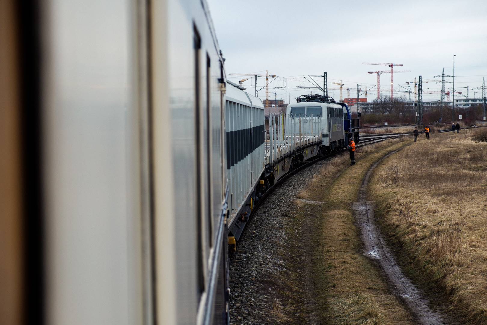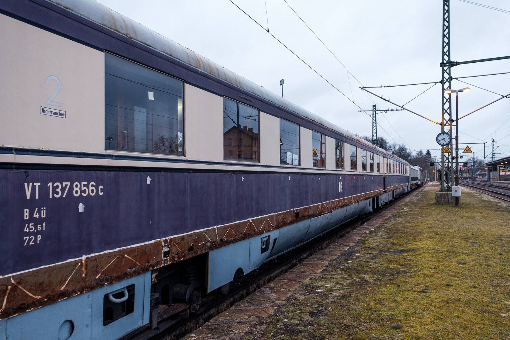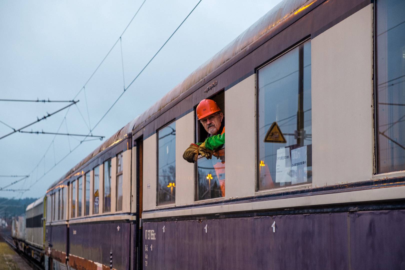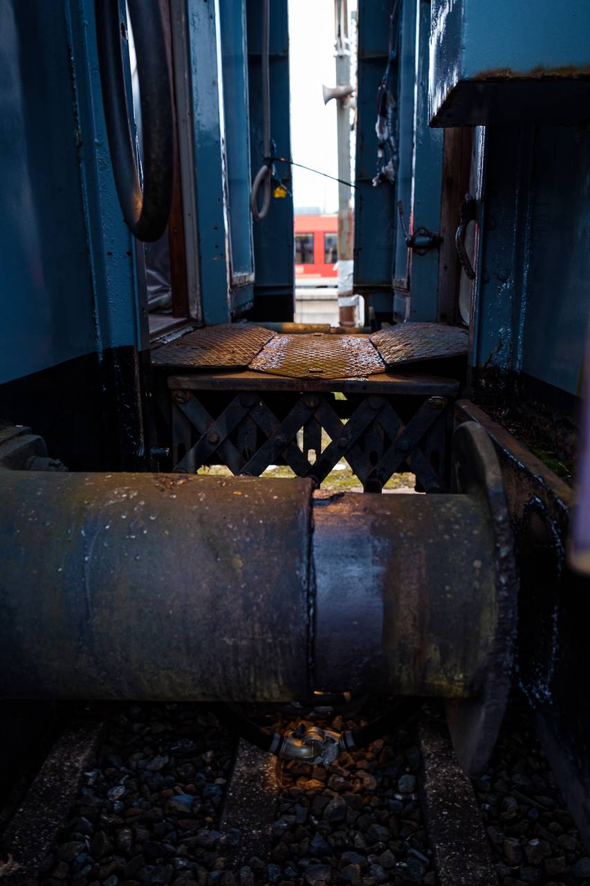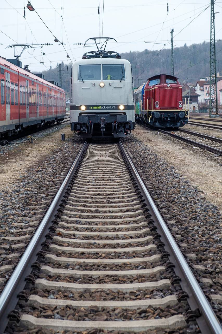 The transfer took two days and lead from Munich via the Altmühl valley and many other small branch lines via Bamberg and the Saale valley to Delitzsch near Leipzig. The train was coupled between two adapter cars and a few brake cars to a locomotive from Rail Adventure, who was responsible for the whole transfer. We needed to check at each halt and during the ride that everything was technically OK and there were no bearings running hot.