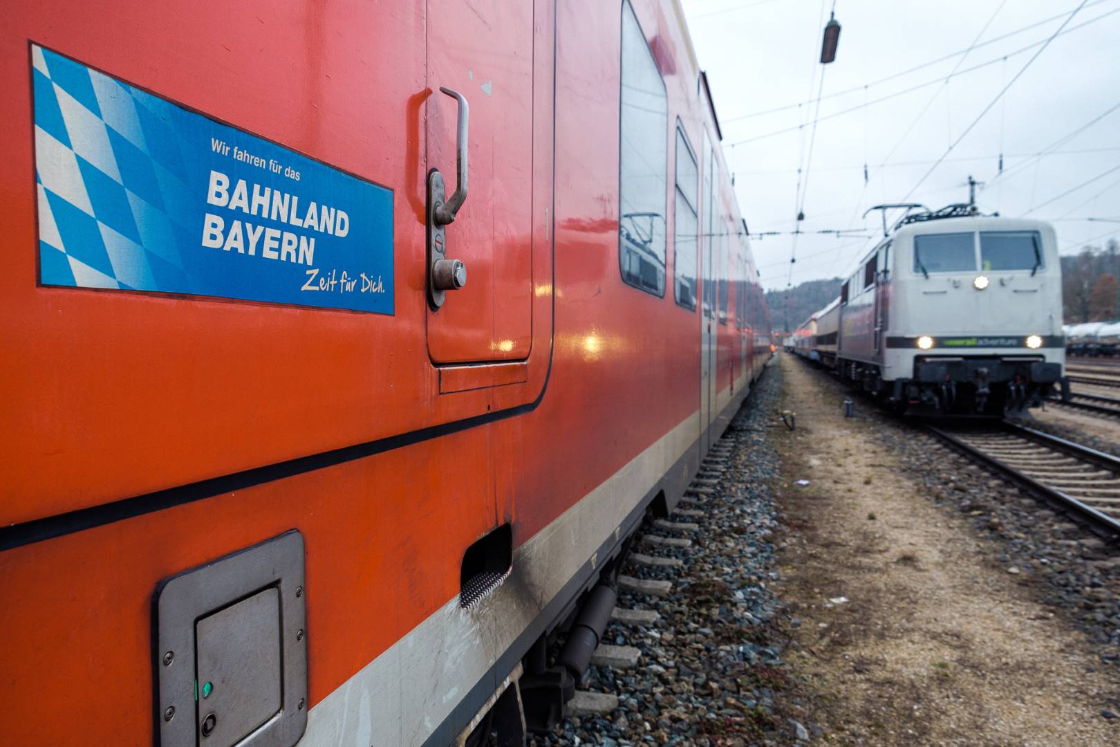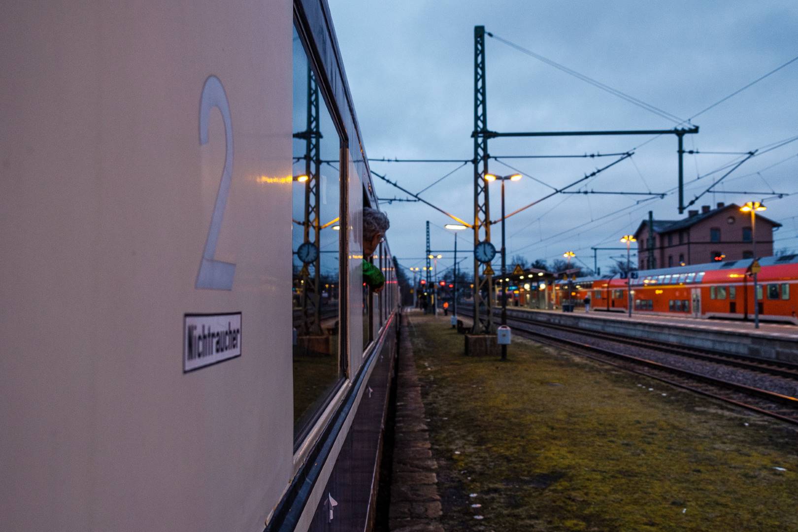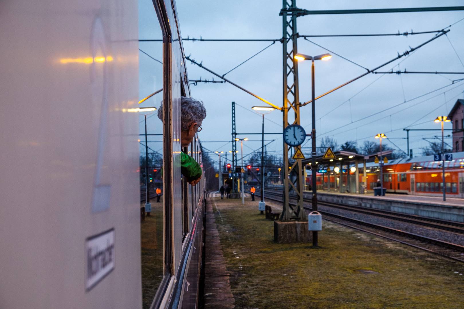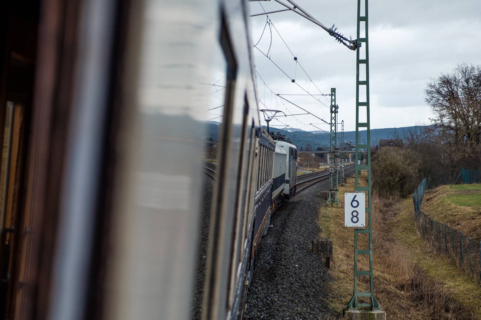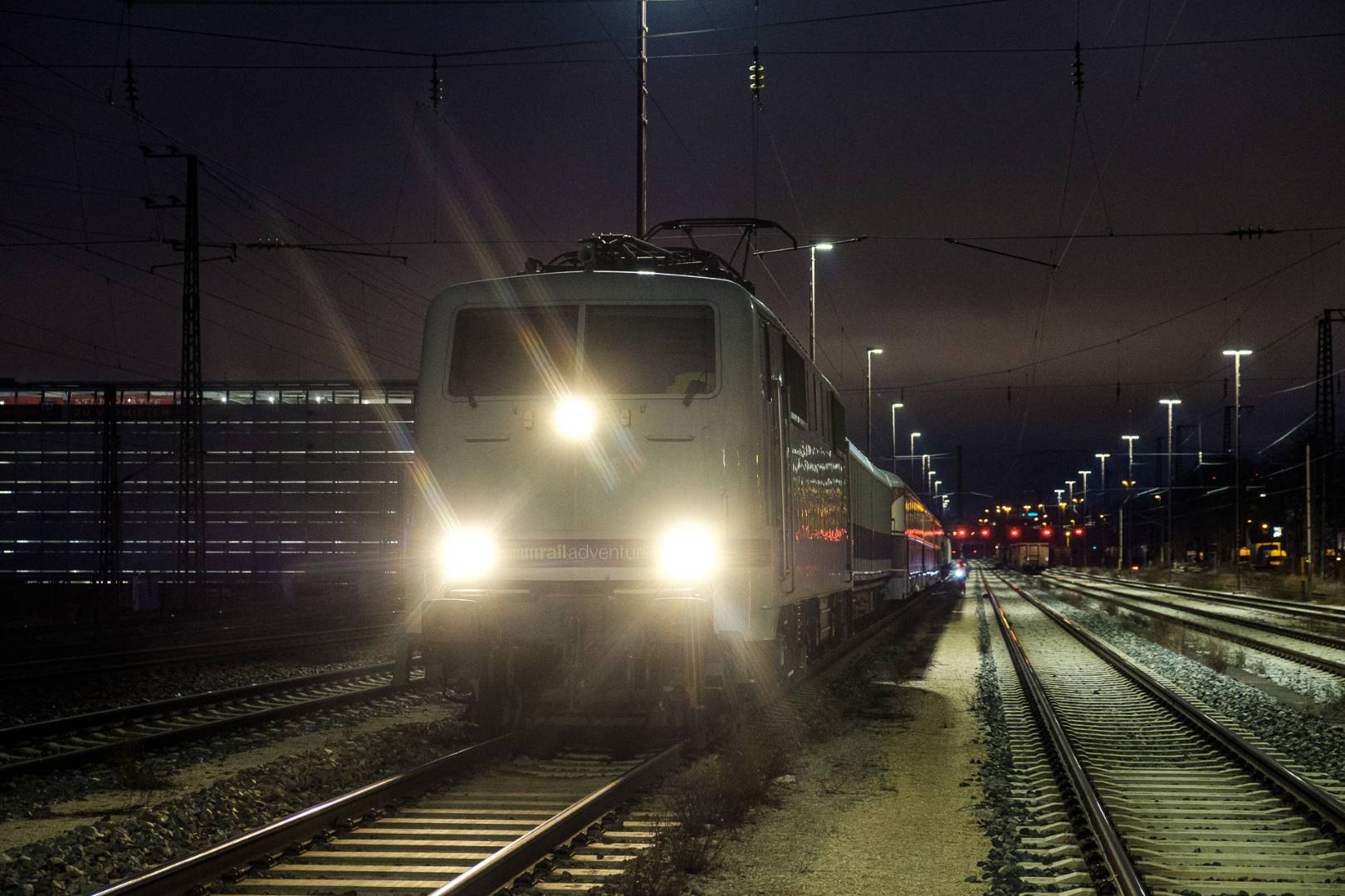 The transfer took two days and lead from Munich via the Altmühl valley and many other small branch lines via Bamberg and the Saale valley to Delitzsch near Leipzig. The train was coupled between two adapter cars and a few brake cars to a locomotive from Rail Adventure, who was responsible for the whole transfer. We needed to check at each halt and during the ride that everything was technically OK and there were no bearings running hot.