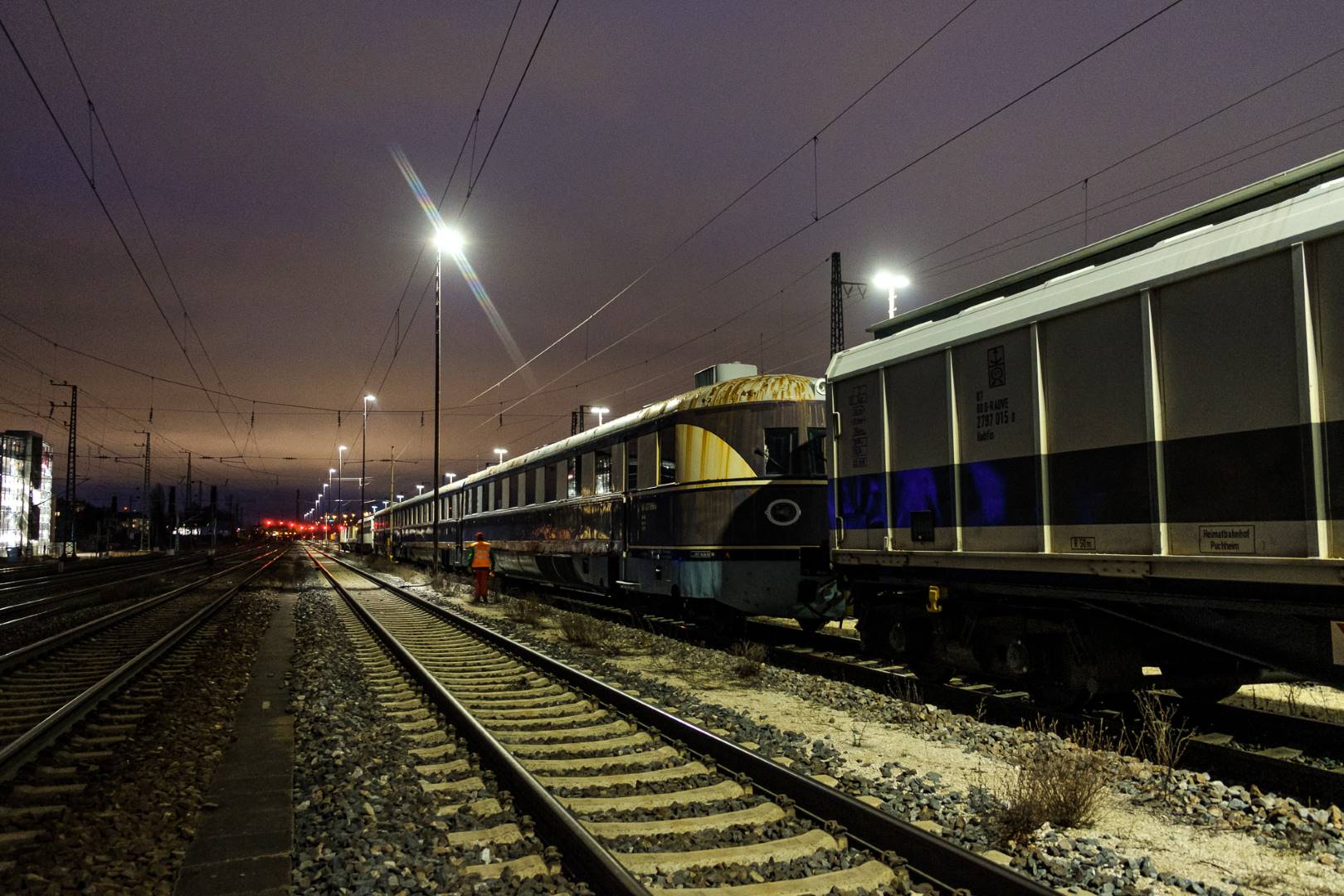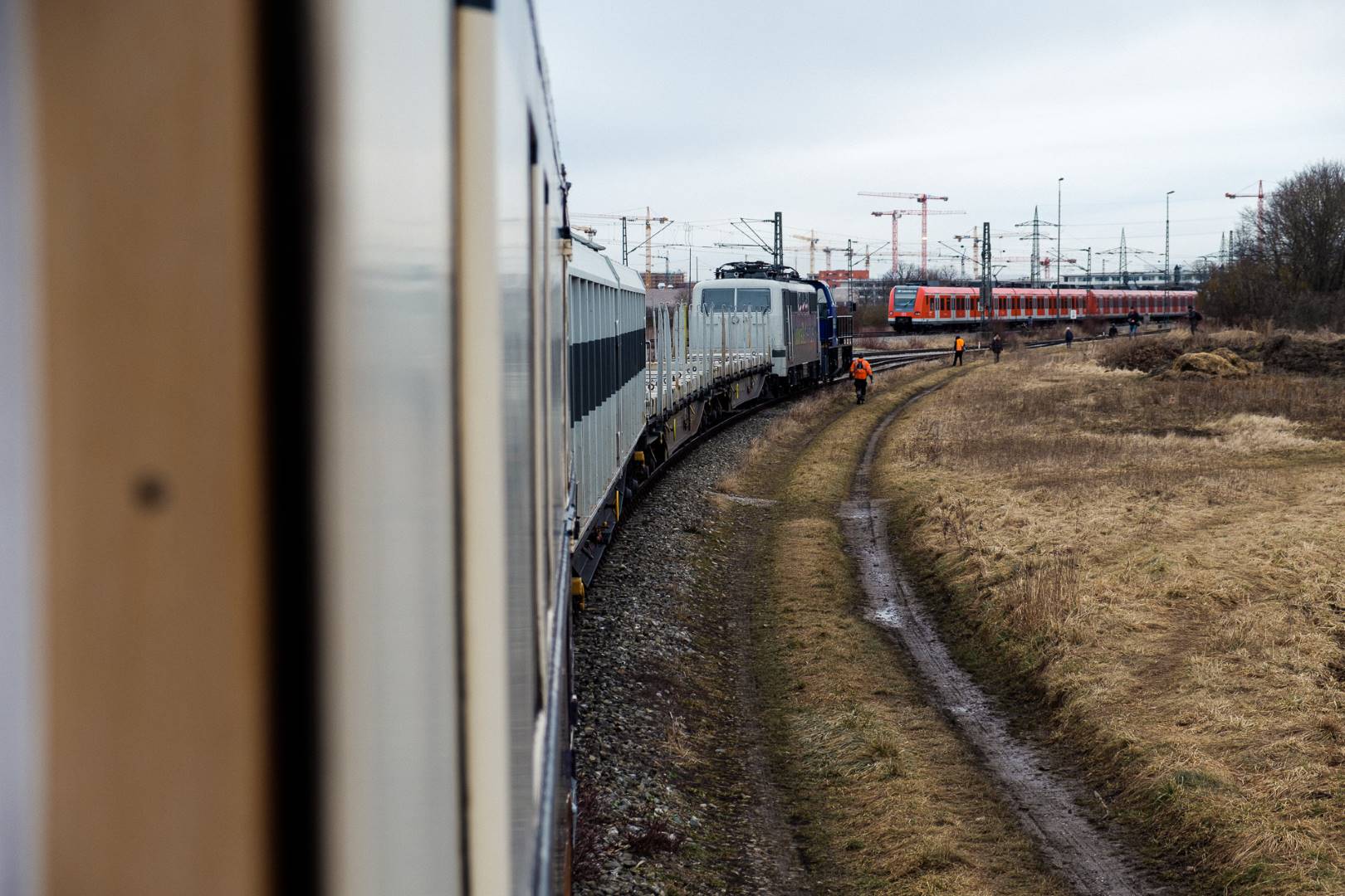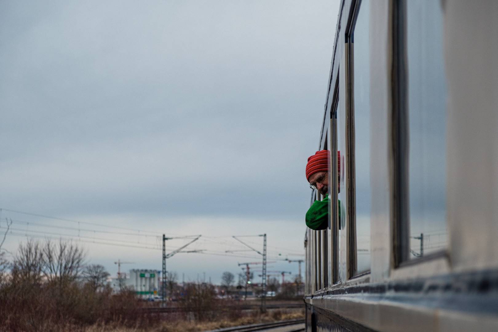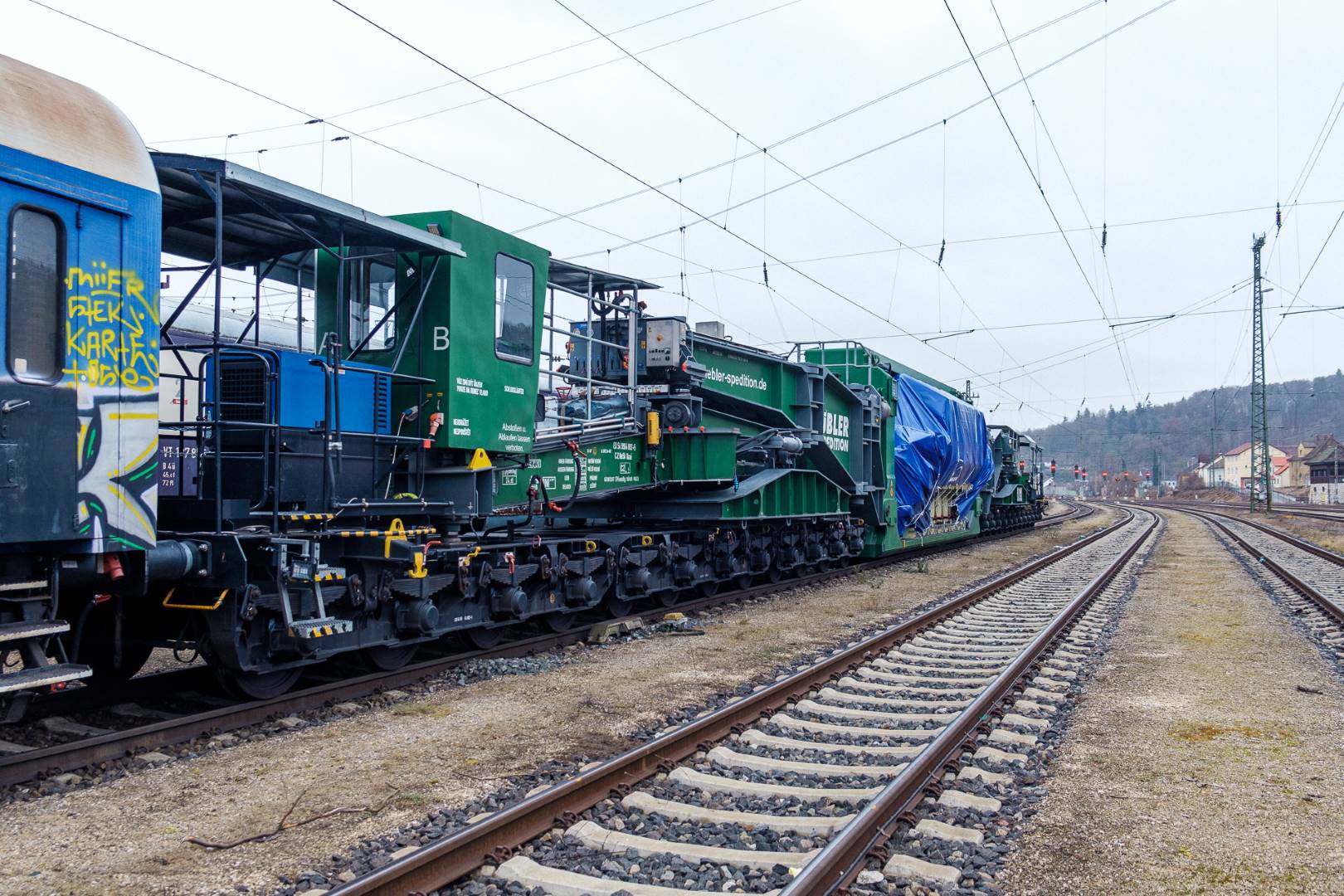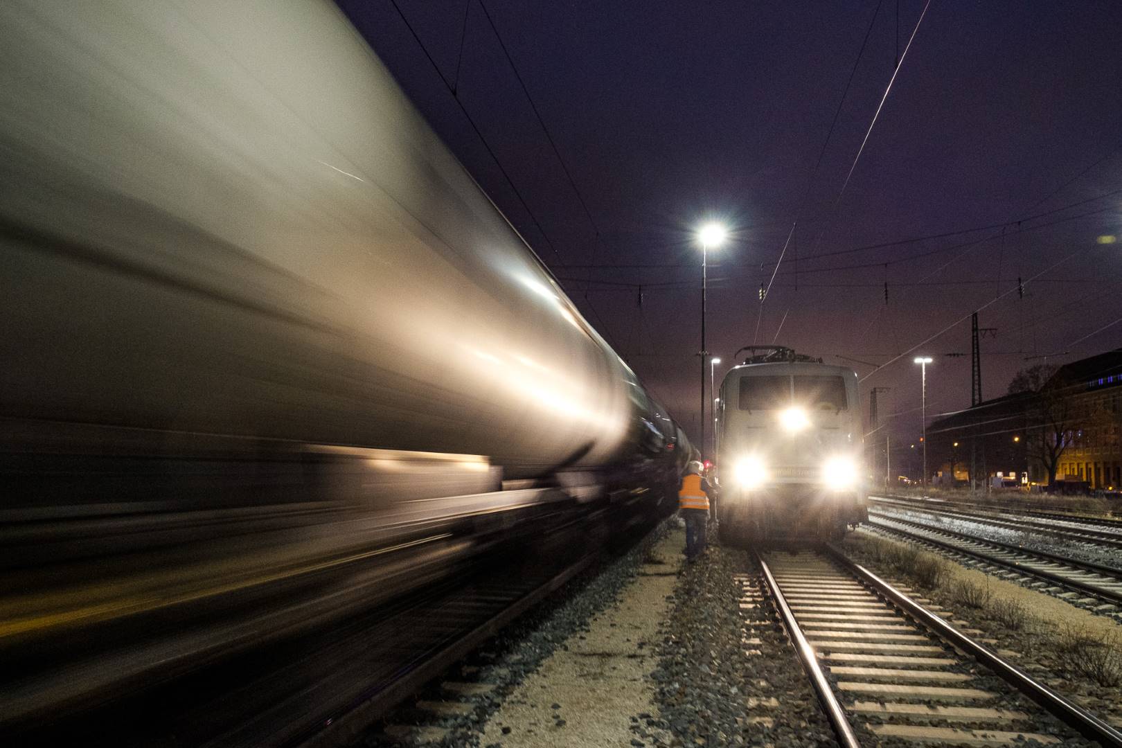 The transfer took two days and lead from Munich via the Altmühl valley and many other small branch lines via Bamberg and the Saale valley to Delitzsch near Leipzig. The train was coupled between two adapter cars and a few brake cars to a locomotive from Rail Adventure, who was responsible for the whole transfer. We needed to check at each halt and during the ride that everything was technically OK and there were no bearings running hot.