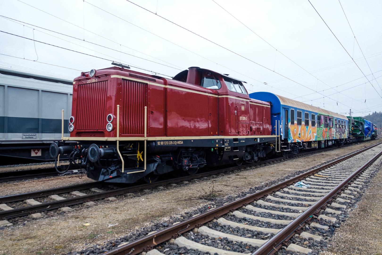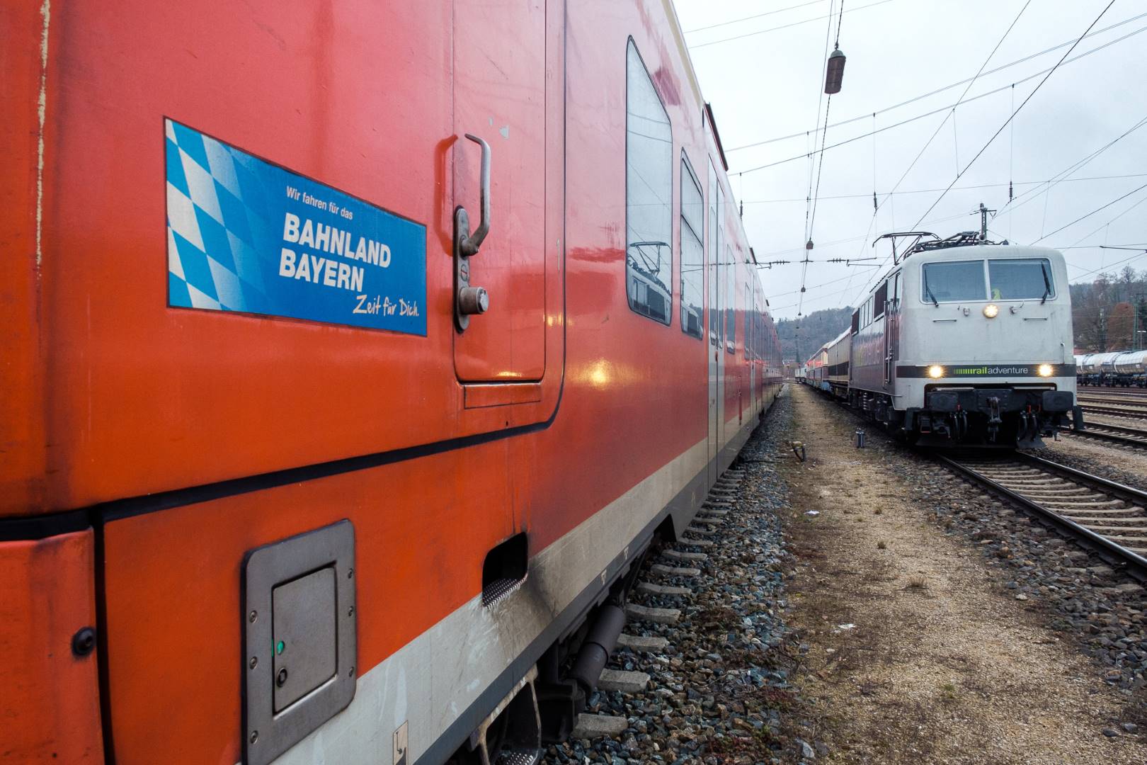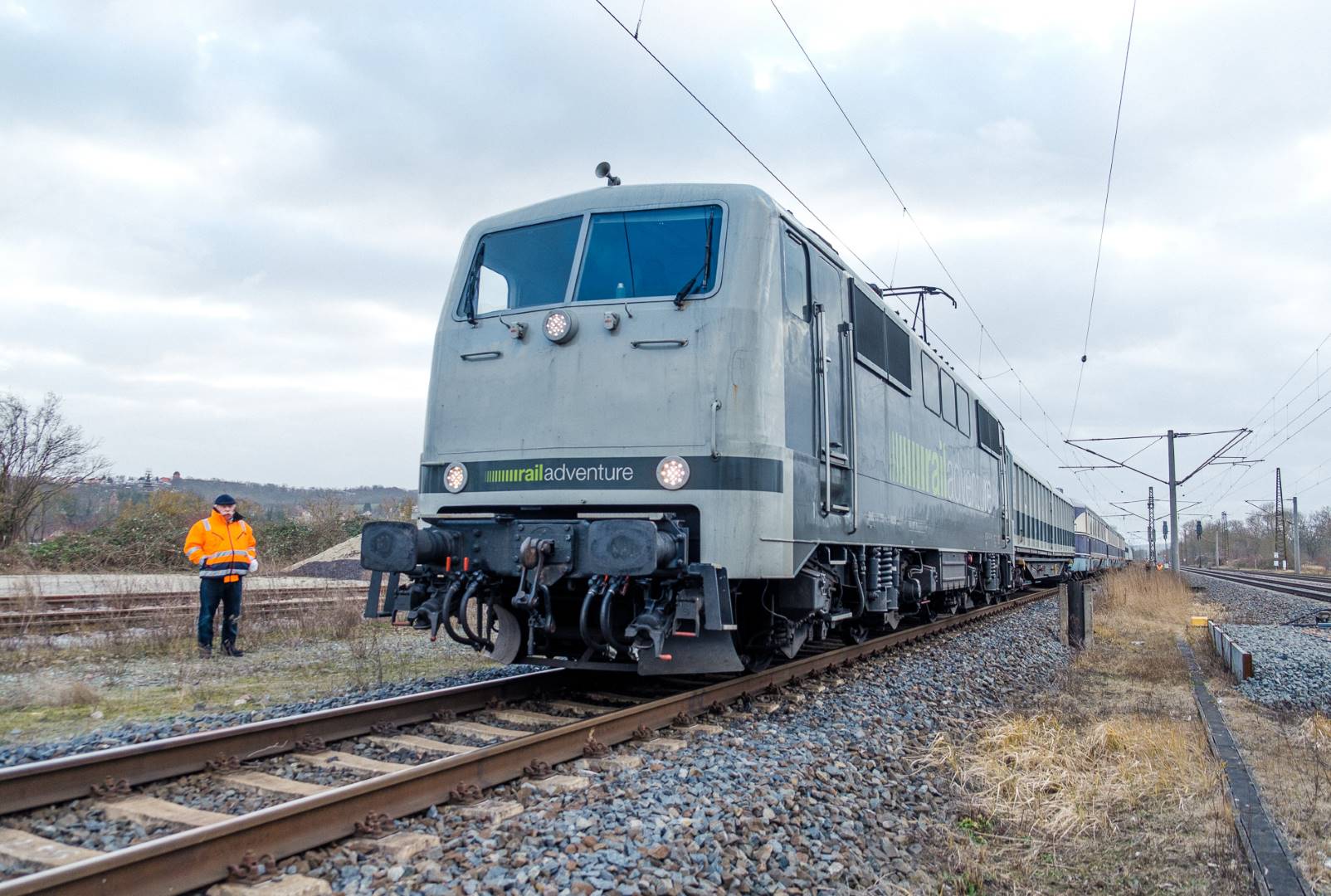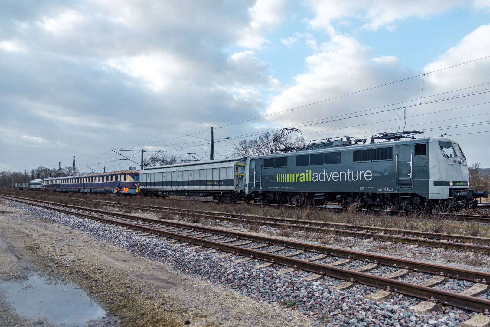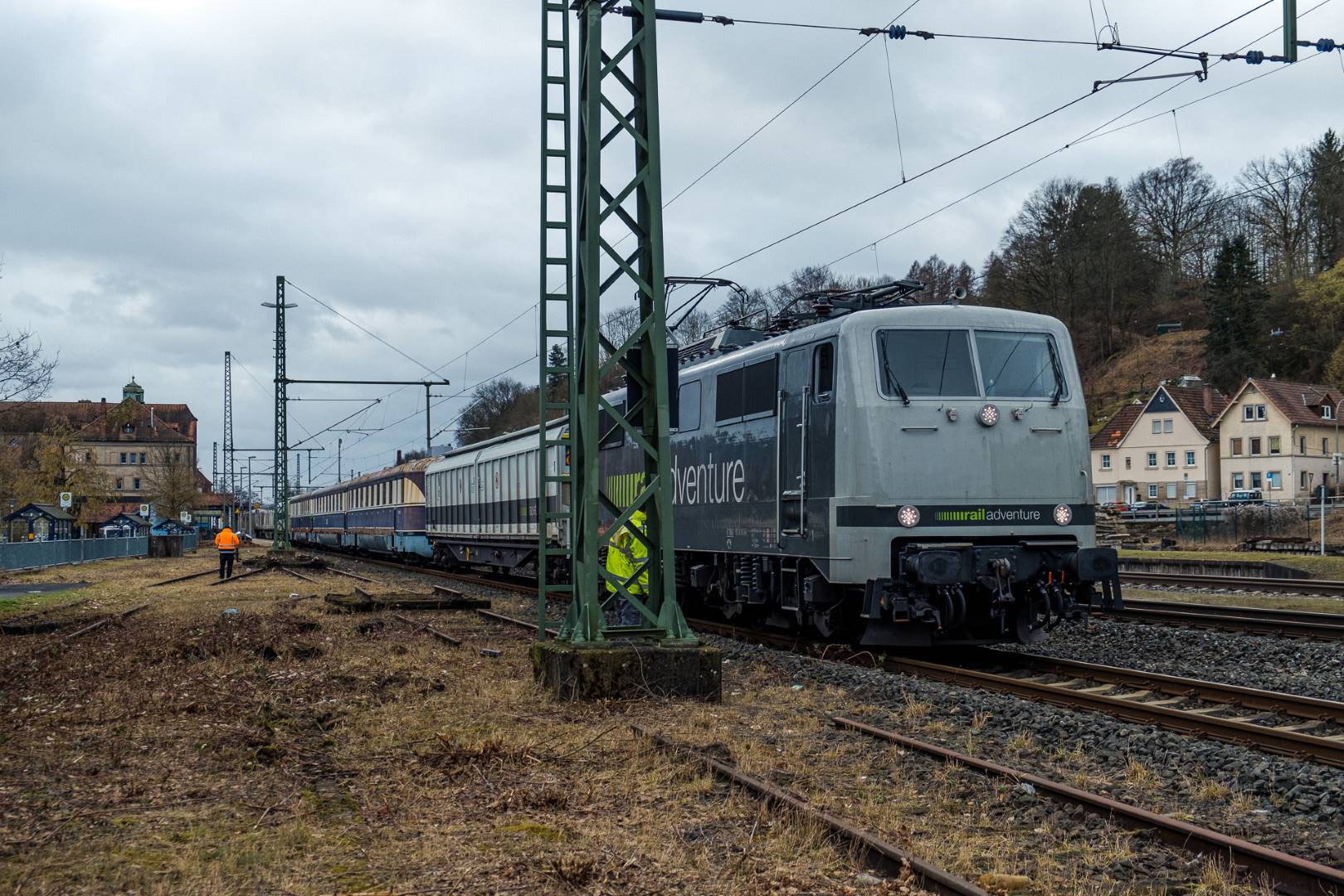 The transfer took two days and lead from Munich via the Altmühl valley and many other small branch lines via Bamberg and the Saale valley to Delitzsch near Leipzig. The train was coupled between two adapter cars and a few brake cars to a locomotive from Rail Adventure, who was responsible for the whole transfer. We needed to check at each halt and during the ride that everything was technically OK and there were no bearings running hot.