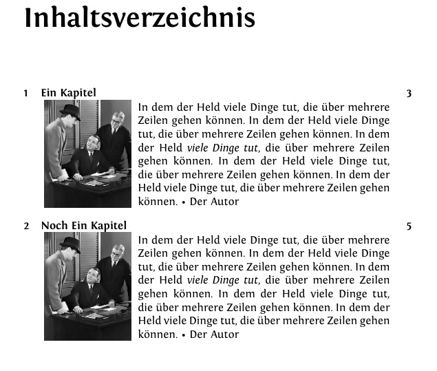 The default LaTeX Style is a no-nonsense, scientific paper like style, which is not really appealing for magazine like content or for literature typesetting. One thing I especially find boring is the table of content, which normally just lists the content.