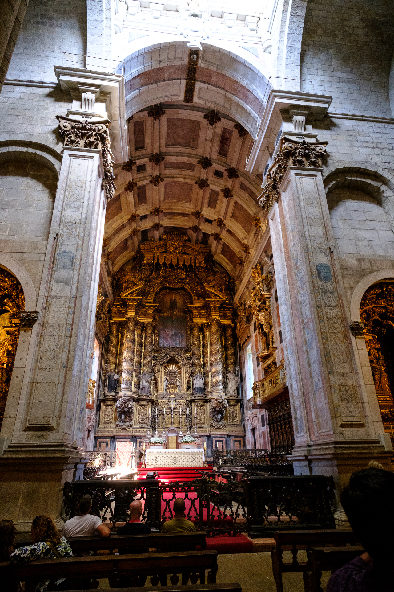 Betritt man die Kathedrale, kommt man an zwei Taufbecken aus rosanem Marmor vorbei, die aus dem Ende des 17. Jahrhunderts stammen. Das Mittelschiff der Kathedrale ist noch klar romanisch, mit einem beeindruckendem Tonnengewölbe. Der vergoldete Altar stammt aus dem 18. Jarhundert und ist ein Meisterwerk des Joaninischen Barockes. Die Fresken in der Apsis sind ebenfalls von Nicolau Nasoni. Links und rechts des Altars befinden sich im Hauptschiff zwei Marienbilder: links die 1984 zur Schutzherrin Portos erklärte Nossa Senhora da Vendoma, rechts die Nossa Senhora da Silva. Die Nossa Senhora da Vendoma (unsere liebe Frau von Vendome) führt sich zurück auf die Zeit der Reconquista, als Porto von Basken aus der Stadt Vendome von den Mauren zurückerobert wurde. Über die Nossa Senhora da Silva (unsere liebe Frau aus dem Wald) wird erzählt, dass Steinmetze dieses Marienbild im Wald fanden, als sie die Steine für die Kathedrale aus dem Fels schlugen.