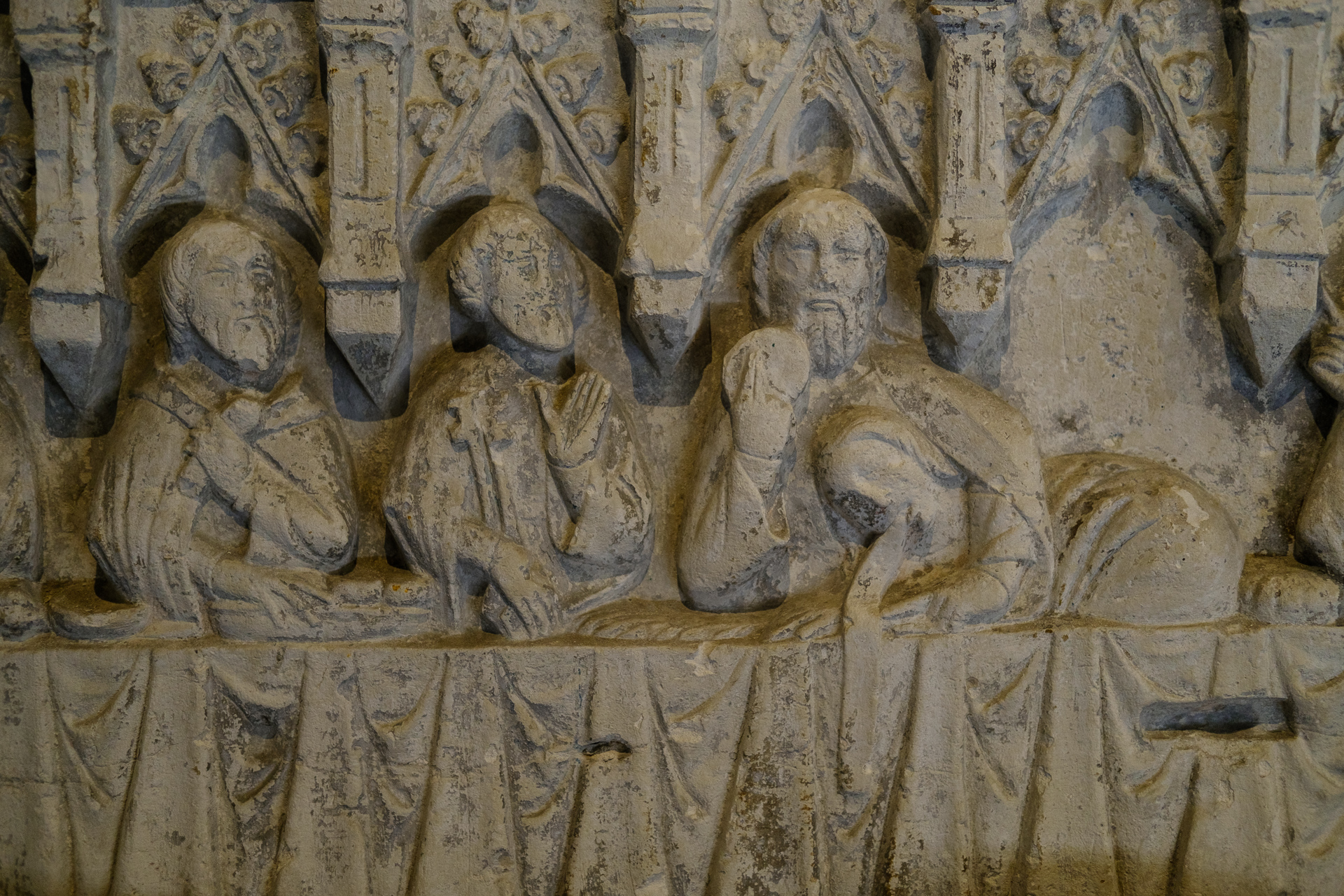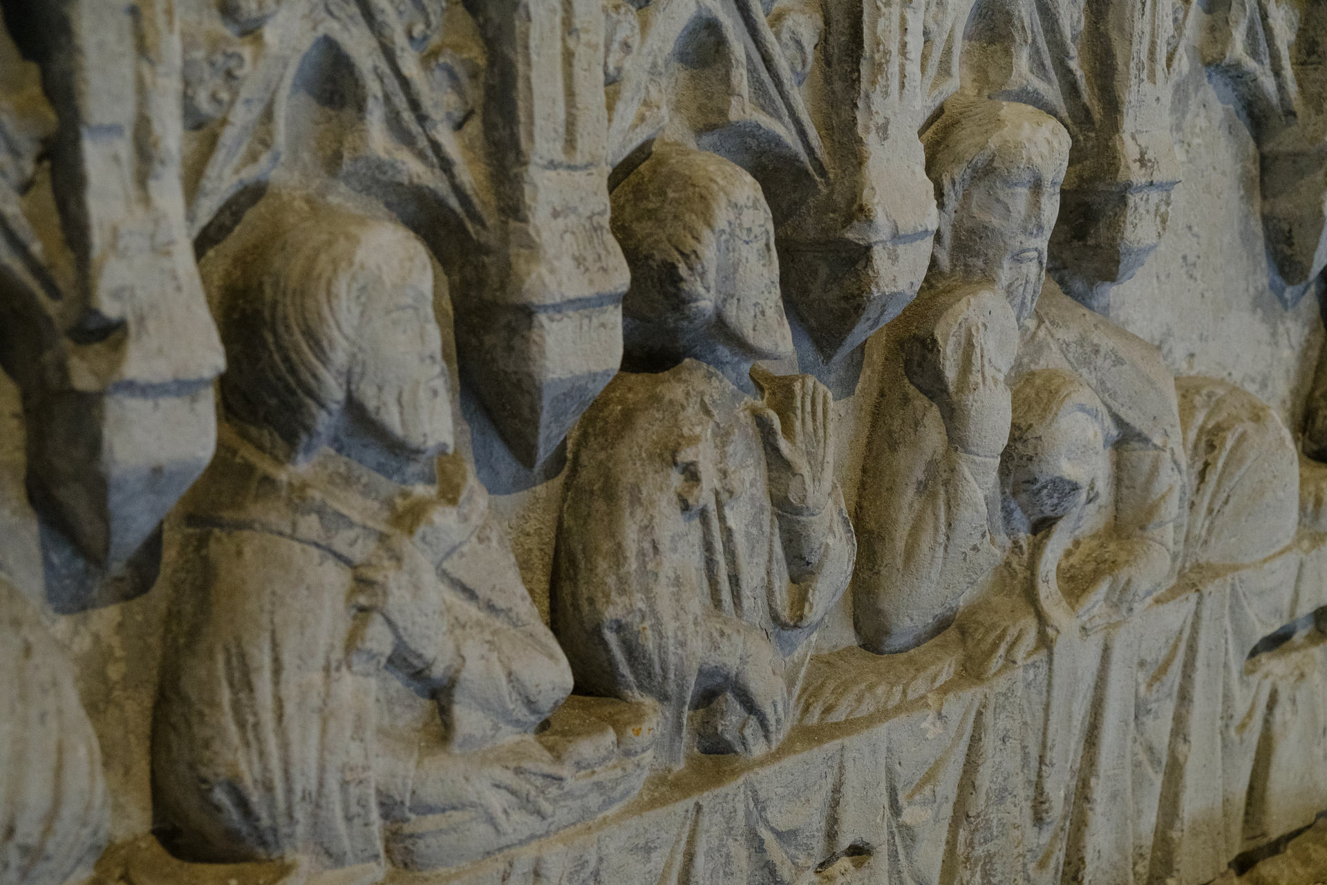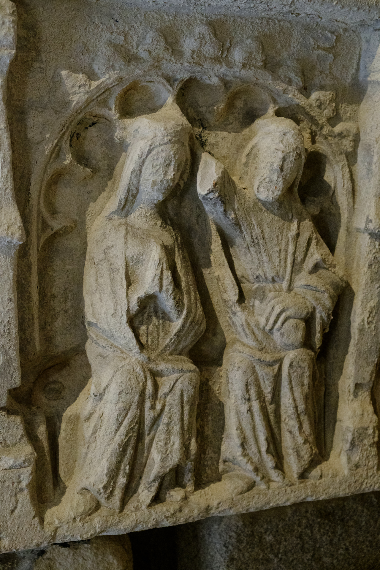 Der Sarg zeigt auf seiner der Kapelle zugewandten Seite das letzte Abendmahl. Das Fußende ziert eine Darstellung des Kalvarienberges mit der Kreuzigung Jesu, am Kopfende wird die Krönung Mariens dargestellt. Auf dem Sarkophag findet sich die Figur des João Gordo in der Kleidung eines Malteserritters. Die Darstellung des Abendmahles ist etwas kurios, Jesus scheint eine der Figuren im Schwitzkasten zu halten. Dieser Figur kommt ein langes Band aus dem Mund. Die Bedeutung dieser Darstellung habe ich noch nicht ergründen können.